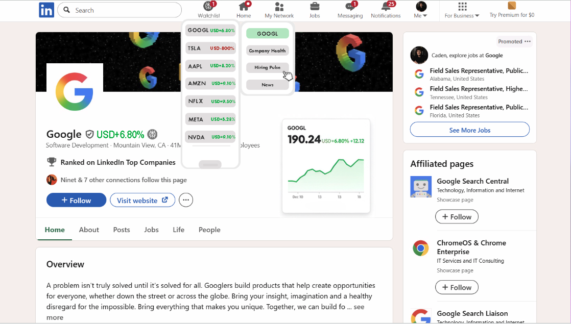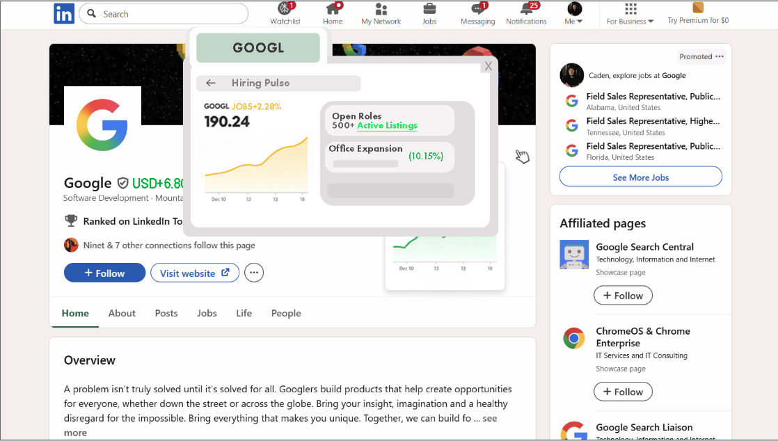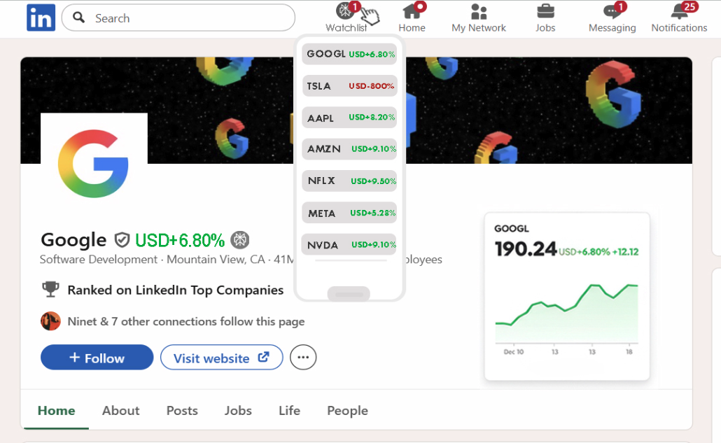 Clicking the icon to “add to watchlist” adds the company to the company watchlist widget on the top of the LinkedIn page.